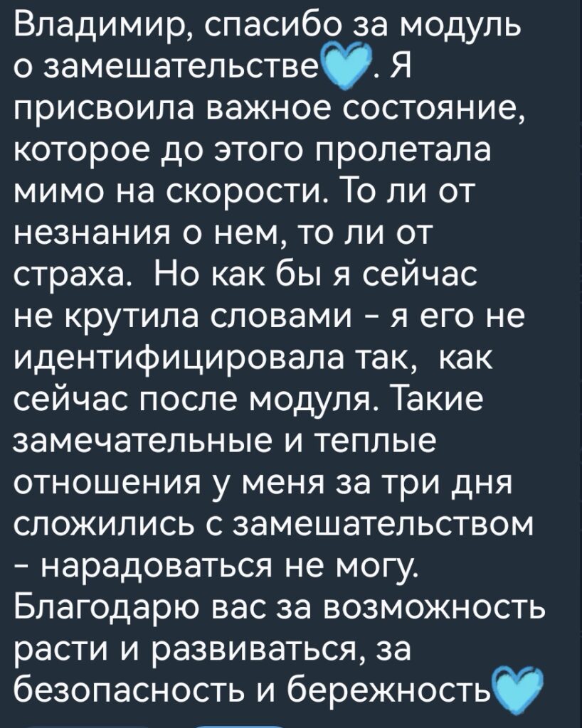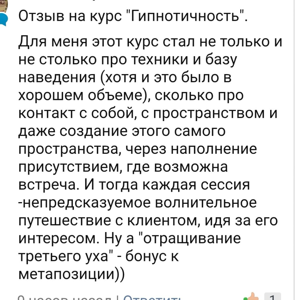 Для меня этот курс стал не только и не столько про техники и базу наведения (хотя и это было в хорошем объеме), сколько про контакт с собой, с пространством и даже создание этого самого пространства, через наполнение присутствием, где возможна встреча. И тогда каждая сессия -непредсказуемое волнительное путешествие с клиентом, идя за его интересом. Ну а «отращивание третьего уха» — бонус к метапозиции))